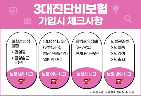 이 인포그래픽은 "3대 진단비 보험 가입 시 체크사항"을 보여줍니다. 허혈성 심장질환, 남녀 생식기암, 질병 후유증해, 뇌혈관질환 등 다양한 항목을 체크해야 합니다. 이러한 체크리스트를 통해 자신에게 맞는 보험을 선택할 수 있습니다.
