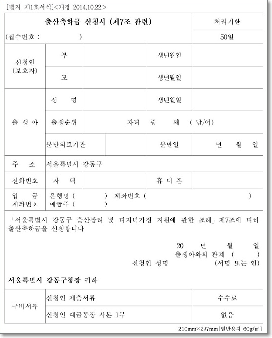 한 자녀에 대한 출산지원금은 지역에 따라 차이가 있지만, 일반적으로 80만 원에서 200만 원 사이의 지원이 이루어집니다. 각 지역에서 제공하는 추가 혜택도 있으니, 자신의 지역에서 어떤 지원이 이루어지는지 확인하는 것이 중요합니다. 아래 이미지는 출산축하금 신청서 양식입니다.