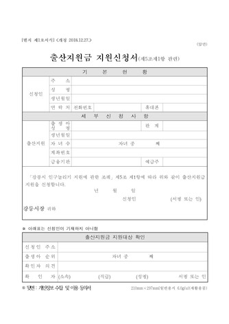 신청 방법은 각 지자체의 정책에 따라 상이할 수 있습니다. 대부분의 경우, 온라인 신청이 가능하며, 직접 방문해서 신청할 수도 있습니다. 이를 통해 편리하게 지원금을 신청할 수 있습니다. 아래의 이미지는 출산지원금 신청서 양식입니다.