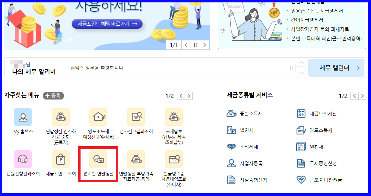 > 홈 화면 > 자주 찾는 메뉴 > 편리한 연말정산 클릭