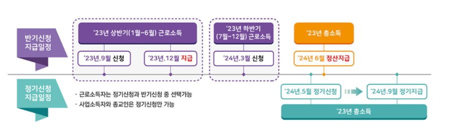 신청안내문을 받지 못하신 경우에는 우선 본인 가구의 소득, 재산 요건 등 먼저 확인하신 후애 홈택스(PC·모바일앱) 또는 서면으로 신청하시면 됩니다. 그리고 소득이 근로소득 외 사업소득이나 종교인소득이 있는 경우에는 반기신청 대상자가 아니라 정기신청(5월) 대상이므로 5월에 신청하셔야 합니다.