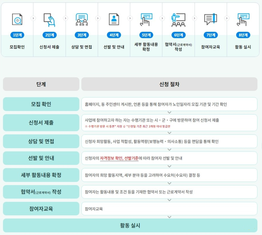 노인일자리 여기, 복지로, 정부24 누리집을 통해 신청할 수 있습니다.